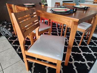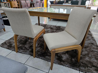 São diversas opções de cadeiras em madeira, com opções de tecidos e cores.